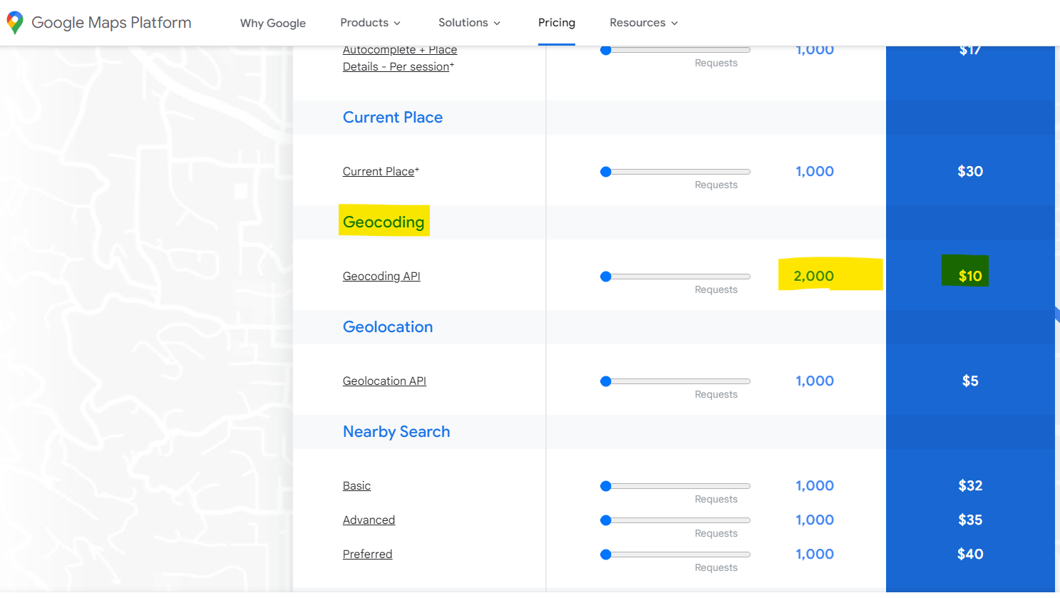 아쉽게도 Geocode는 한달에 1,000개의 위경도 좌표만 무료로 변환할 수 있으며,