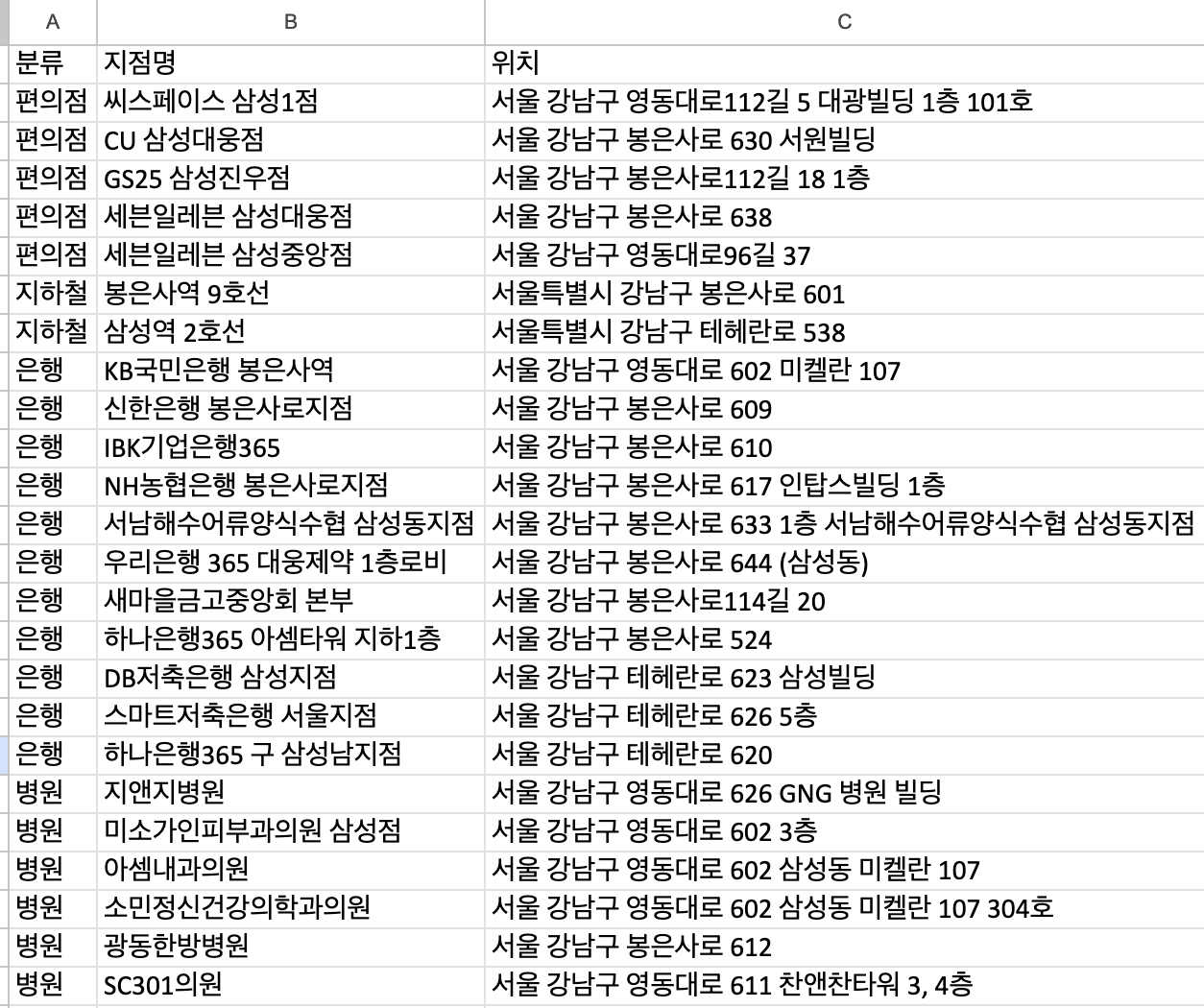 각 지점에 대한 주소 정보를 담고 있는 샘플 데이터입니다.