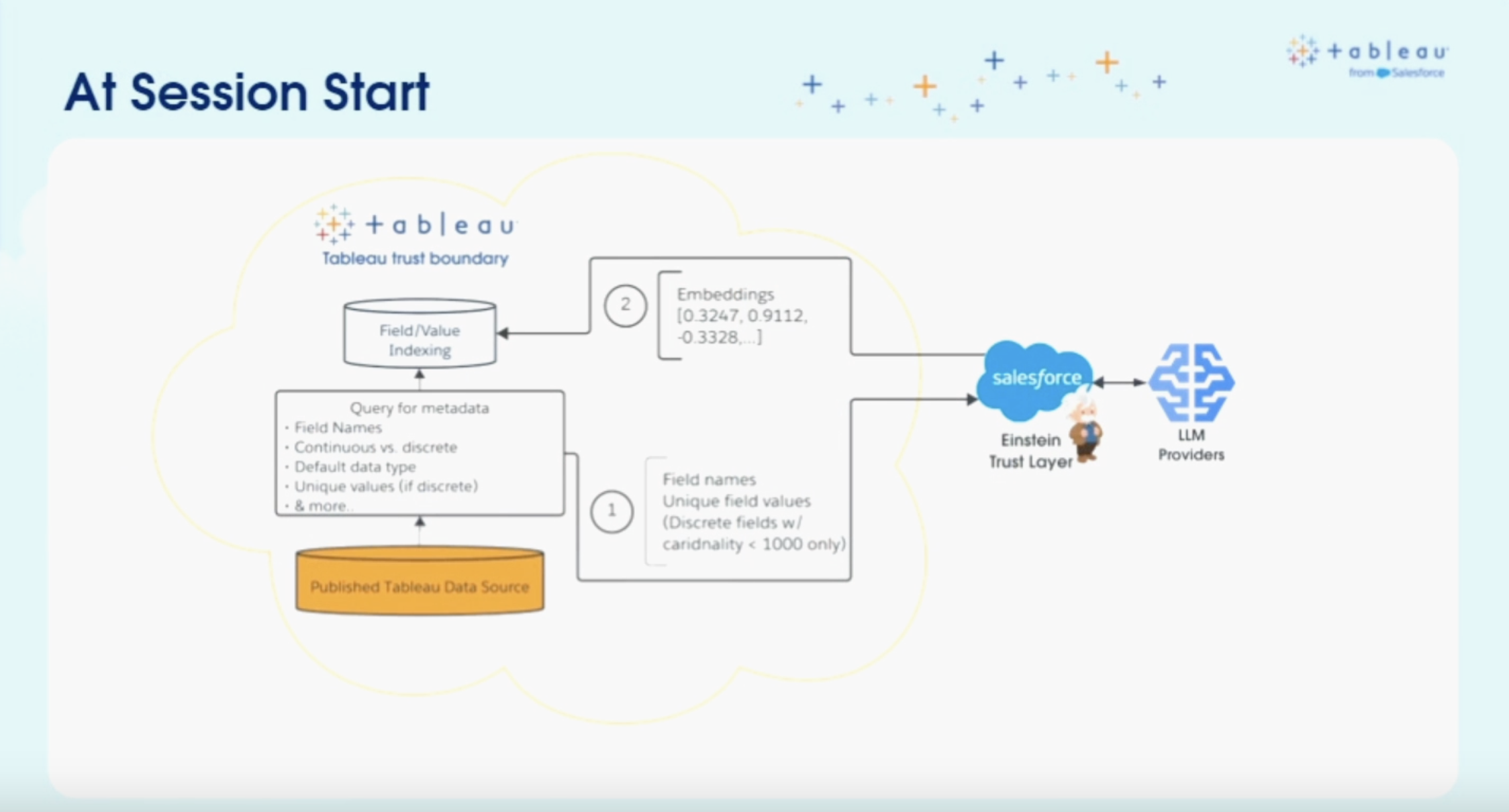 - 쿼리된 데이터는 Tableau의 신뢰 경계 내에서 검색 및 벡터 검색 인덱스를 생성하고, 사용자가 접근할 수 있는 데이터 모델을 사용하여 쿼리를 기반으로 한다.