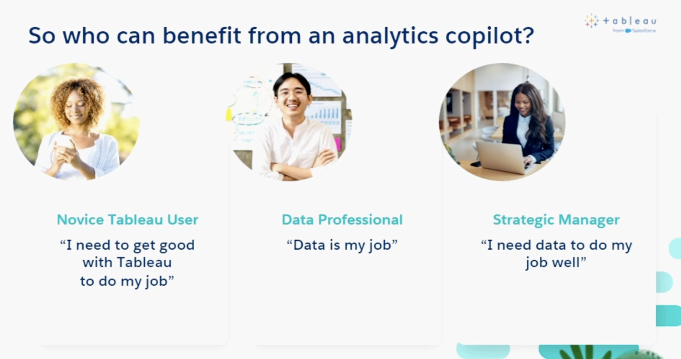 - 조직 내 다양한 사람들이 데이터 작업을 전업으로 하거나 일부로 할 때, AI 보조자는 이 모든 군을 지원하여 작업의 효율성을 높인다.