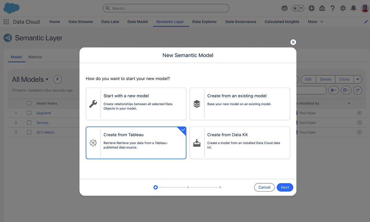 Data Cloud에 정의된 Semantics 모델(semantic model)을 Tableau로 가져오면, 기존의 계산된 필드, 관계형 데이터 구조, 계층적 의미 등이 손실 없이 그대로 적용됩니다. - 데이터 마이그레이션 필요 없음