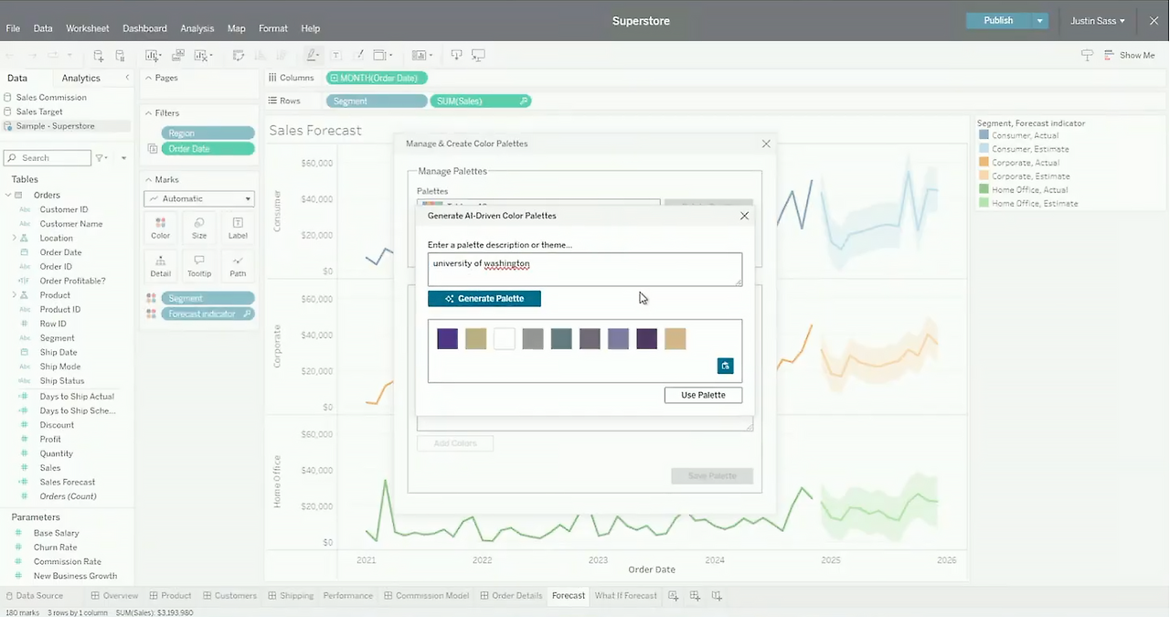 기존에는 색상을 직접 하나하나 고르거나 Tableau 기본 팔레트만 쓸 수 있었다면, 해당 기능이 추가되면 AI에게 말로 색상을 설명하면 Tableau가 거기에 어울리는 색상 팔레트를 자동 생성해줍니다.