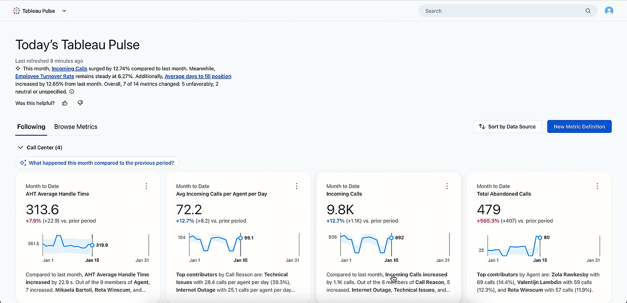 Tableau Pulse에서 "Tell Me Why" 버튼을 클릭하면 AI 에이전트가 대시보드부터 뉴스, 날씨, 심지어 소셜 미디어까지 내부 및 외부 데이터를 검색하여 인용문과 실행 가능한 다음 단계를 포함하여 지표에 대한 세부적인 설명을 제공합니다.