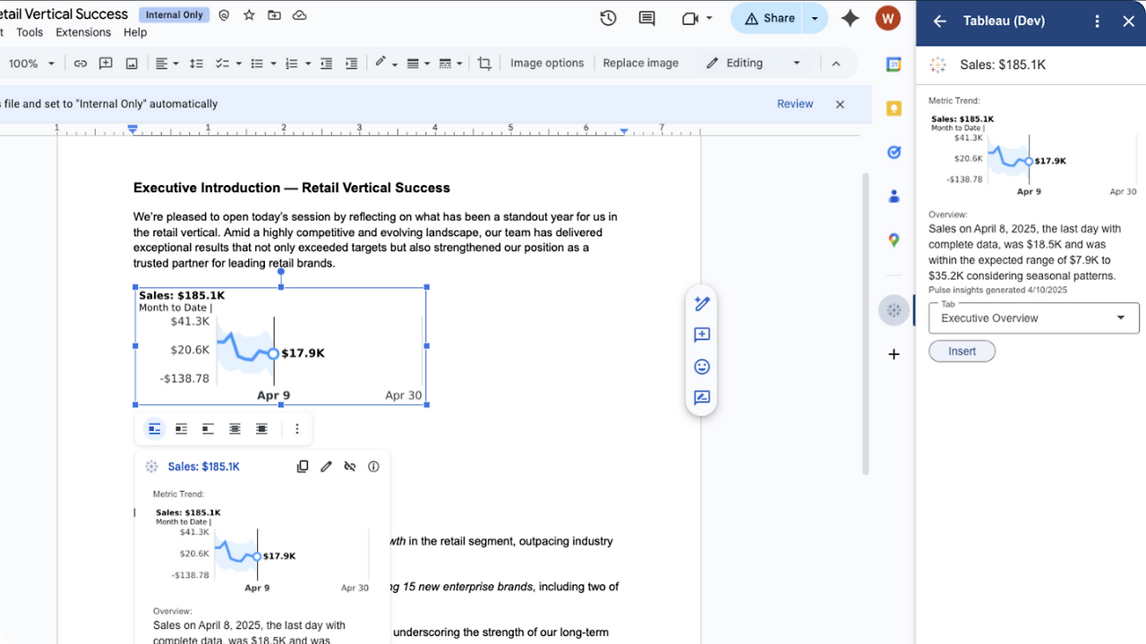 이제 Google 문서나 프레젠테이션(Google Docs & Slides)에 Tableau 대시보드를 직접 넣을 수 있게 되었습니다.