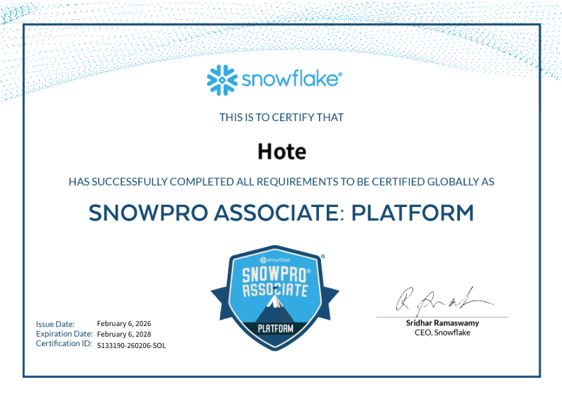 SnowPro Associate: Platform Certification Exam 시험에 합격했습니다. 👏👏👏스노우플레이크를 배워보고 싶다고 생각만 하다가1월에 진행했던 Snowflake Platform Training에 참여하고참여자들을 대상으로 바우처를 제공해줘서 시험에 응시하게 되었습니다.1. 시험 정보먼저 SnowPro Associate: Platform Certification Exam 시험 정보입니다시험 버전: SOL-C01총 문항 수: 65문항문항 유형: 복수 선택형(Multiple Select), 단일 선택형(Multiple Choice), 인터랙티브형시험 시간: 85분지원 언어: 영어, 일본어, 중국어, 한국어, 프랑스어, 스페인어응시료: 100달러(USD)인도 응시료: 80달러..